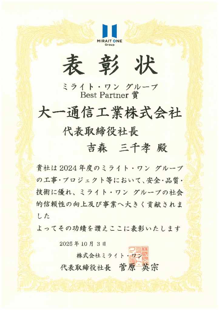 新着情報お知らせ 株式会社ミライト・ワン様より表彰状を頂戴しました 2025.10.06 月 ミライト・ワン グループ様発注の工事において「2024年度BestPartner賞」を頂戴しました。これを励みに、さらなる安全と品質の向上に努めてまいります。