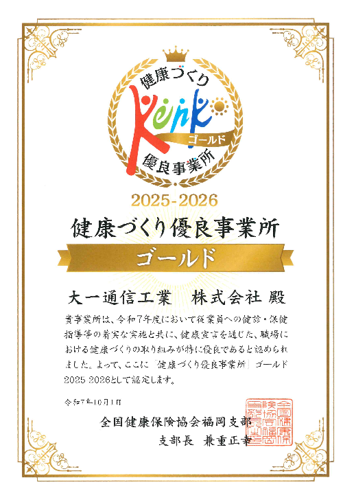 新着情報お知らせ 「健康づくり優良事業所ゴールド」に認定されました 2025.10.02 木 協会けんぽ様より「健康づくり優良事業所ゴールド2025-2026」の認定を頂戴しました。これからも、特定健診・特定保健指導をはじめ、社員の健康維持・増進を図るために努めてまいります。